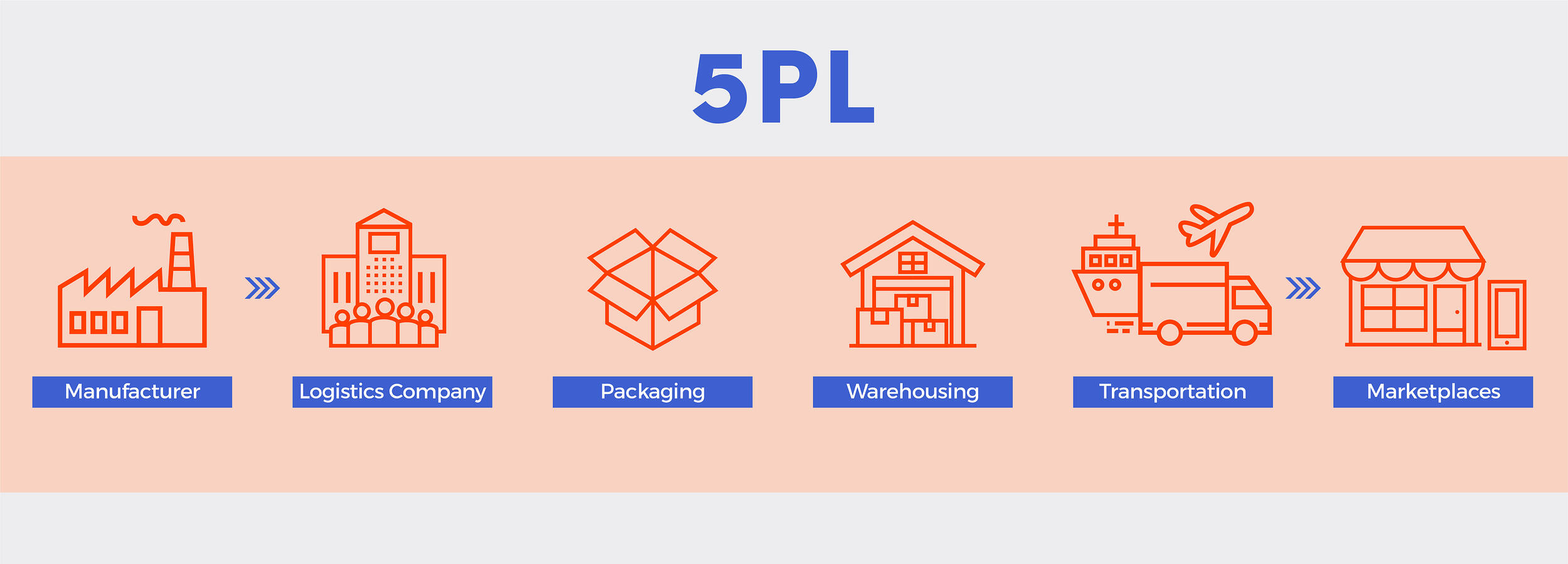 5PL là loại dịch vụ thị trường thương mại điện tử, bao gồm các 3PL và 4PL quản lý tất cả các bên liên quan trong chuỗi phân phối trên nền tảng thương mại điện tử. Chìa khoá thành công của các nhà cung cấp dịch vụ logistics thứ năm là các hệ thống (Hệ thống quản lý đơn hàng (OMS), Hệ thống quản lý kho hàng (WMS) và Hệ thống quản lý vận tải (TMS). Cả ba hệ thống này có liên quan chặt chẽ với nhau trong một hệ thống thống nhất và công nghệ thông tin. Nói tóm lại, ta có thể nhớ đơn giản như sau: