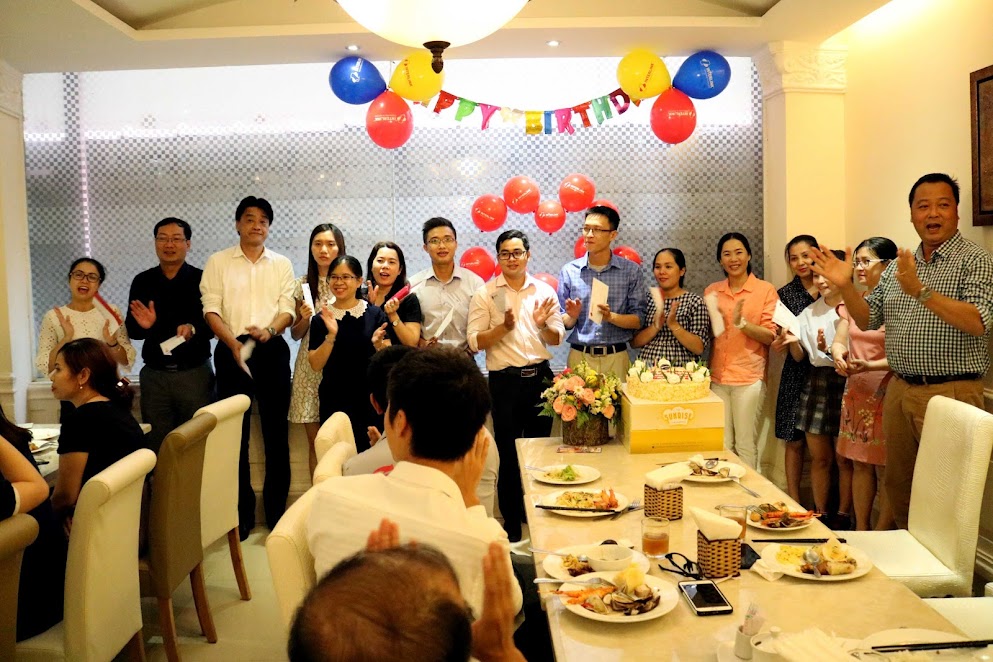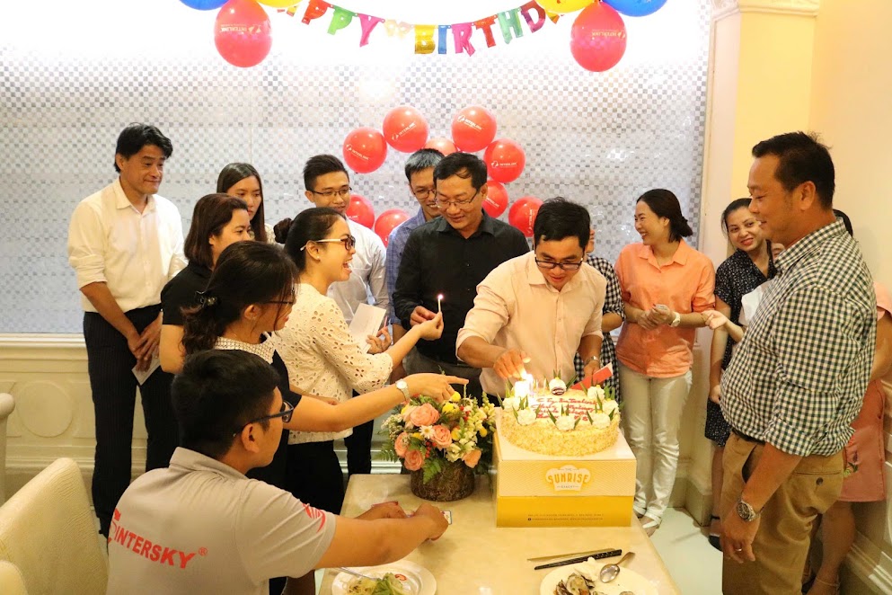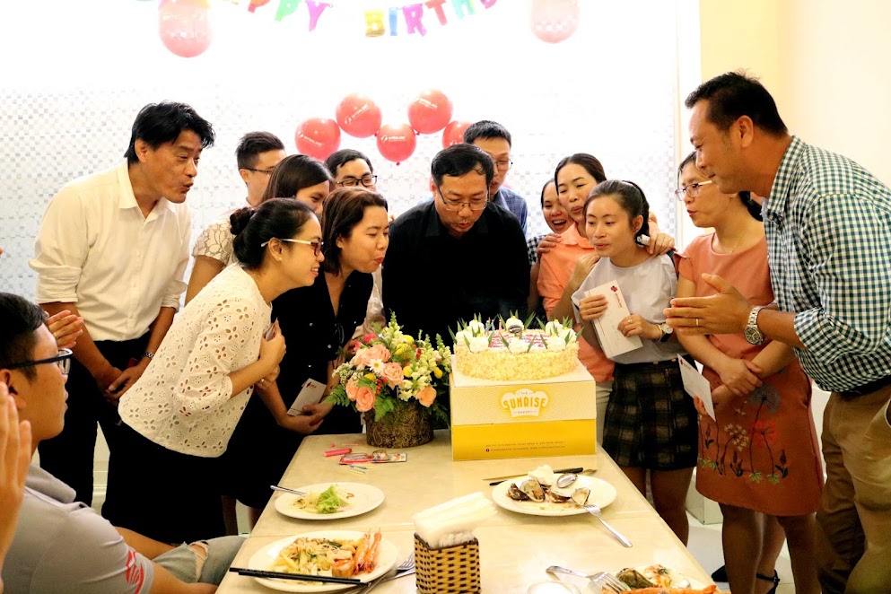 Ông Nguyễn Hữu Khánh – Ct.HĐQT (áo sọc caro) cùng các thành viên thắp và thổi nến chúc mừng sinh nhật. Ông Khánh cũng đã có những lời chúc ý nghĩa tới các thành viên sinh nhật.