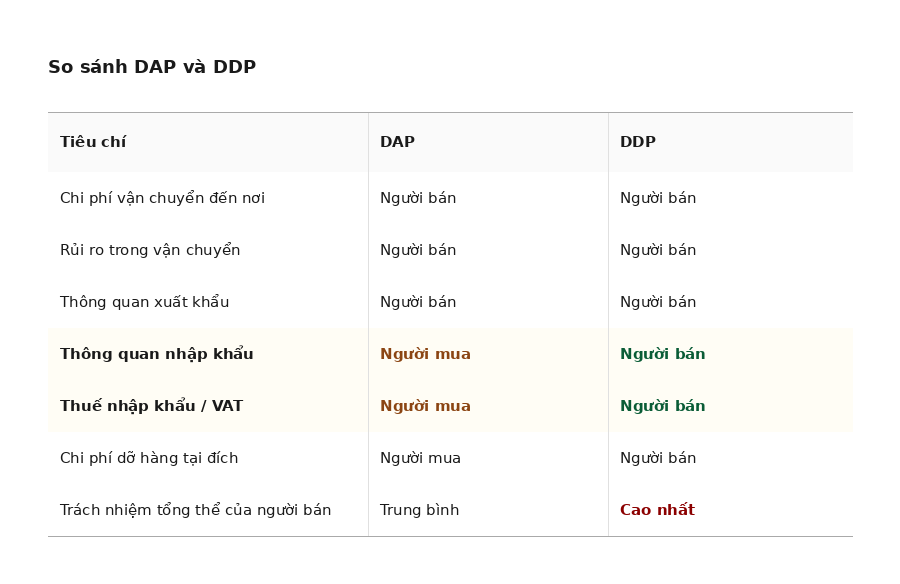 Khác với DDP, theo DAP, người bán không có nghĩa vụ thực hiện thông quan nhập khẩu hay nộp thuế nhập khẩu tại nước đến – phần đó thuộc trách nhiệm của người mua.