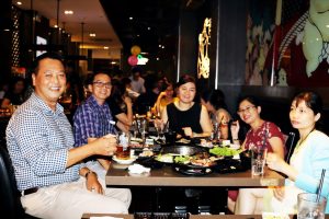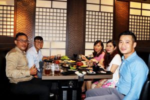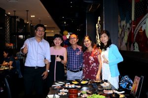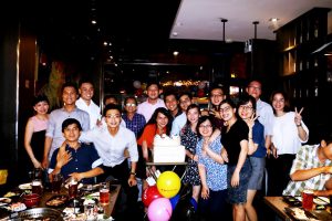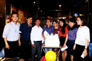 Buổi tiệc sinh nhật có sự góp mặt của đại diện BGĐ : Anh Nguyễn Hữu Khánh – Ct.HĐQT (ngoài cùng bên trái) và chị Trịnh Thục Thùy Dung (đeo mắt kính).