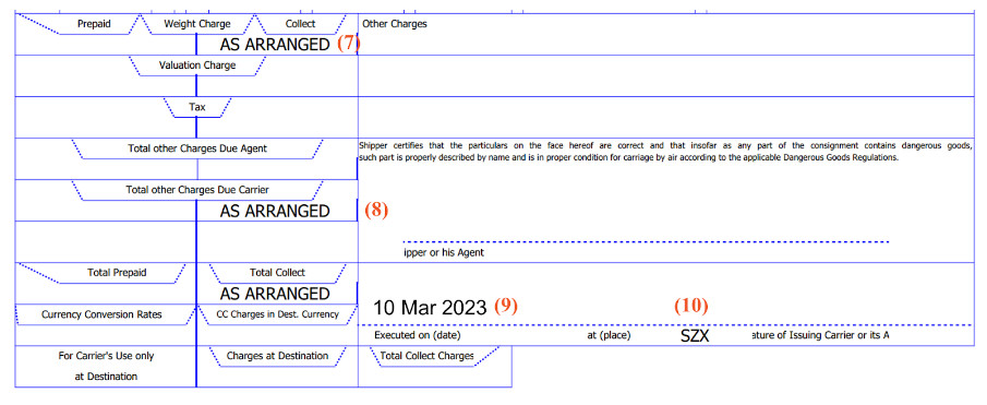 Total other Charge Due Carrier: Tổng các chi phí khác cần trả cho hãng vận chuyển. Tương tự như mục 7, vận đơn hàng không thường sẽ thể hiện “As Arranged” với ý nghĩa “Như đã thoả thuận” vào phần này.