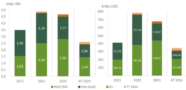 Trong 6 tháng năm 2024, lượng và giá trị xuất khẩu viên nén sang hai quốc gia này chiếm 92% về lượng và 89,9% về giá trị xuất khẩu viên nén của Việt Nam.